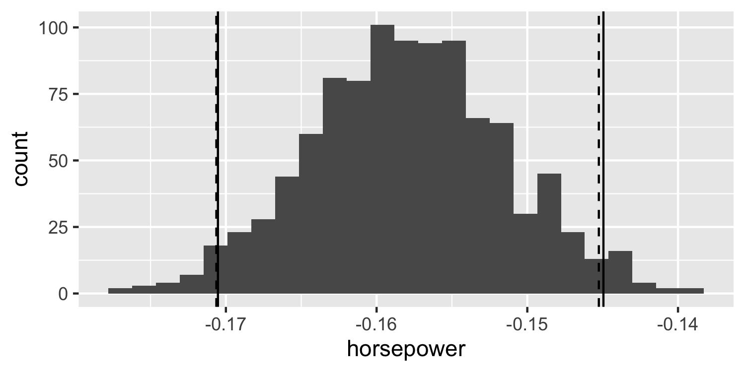 --- ## Let's do this in R ```r model <- lm(mpg ~ horsepower, data = Auto) y_hat <- fitted(model) e <- residuals(model) ``` -- .pull-left[ .small[ ```r set.seed(1) e_star <- sample(e, replace = TRUE) Auto$y_star <- y_hat + e_star new_mod <- update(model, y_star ~ ., data = Auto) coef(new_mod) ``` ``` ## (Intercept) horsepower ## 38.9999721 -0.1506159 ``` ] ] -- .pull-right[ .small[ ```r set.seed(1) bootstrap_residual(e, y_hat, model, Auto) ``` ``` ## (Intercept) horsepower ## 38.9999721 -0.1506159 ``` ]] --- ## Let's do this in R ```r model <- lm(mpg ~ horsepower, data = Auto) y_hat <- fitted(model) e <- residuals(model) ``` .pull-left[ .small[ ```r set.seed(1) e_star <- sample(e, replace = TRUE) Auto$y_star <- y_hat + e_star new_mod <- update(model, y_star ~ ., data = Auto) coef(new_mod) ``` ``` ## (Intercept) horsepower ## 38.9999721 -0.1506159 ``` ] ] .pull-right[ .small[ ```r set.seed(1) bootstrap_residual(e, y_hat, model, Auto) ``` ``` ## (Intercept) horsepower ## 38.9999721 -0.1506159 ``` ```r bootstrap_residual(e, y_hat, model, Auto) ``` ``` ## (Intercept) horsepower ## 40.0583859 -0.1597723 ``` ]] --- ## Let's do this in R ```r model <- lm(mpg ~ horsepower, data = Auto) y_hat <- fitted(model) e <- residuals(model) ``` .pull-left[ .small[ ```r set.seed(1) e_star <- sample(e, replace = TRUE) Auto$y_star <- y_hat + e_star new_mod <- update(model, y_star ~ ., data = Auto) coef(new_mod) ``` ``` ## (Intercept) horsepower ## 38.9999721 -0.1506159 ``` ] ] .pull-right[ .small[ ```r set.seed(1) bootstrap_residual(e, y_hat, model, Auto) ``` ``` ## (Intercept) horsepower ## 38.9999721 -0.1506159 ``` ```r bootstrap_residual(e, y_hat, model, Auto) ``` ``` ## (Intercept) horsepower ## 40.0583859 -0.1597723 ``` ```r bootstrap_residual(e, y_hat, model, Auto) ``` ``` ## (Intercept) horsepower ## 39.0514849 -0.1513228 ``` ]] --- ## purrr - **purrr** is a package for _iterating_ in R - The functions we will use are all `map_xxx()` functions --- ## `map(.x, .f, ...)` -- ### for every element of `.x` do `.f` --- ## Example .small[ ```r library(purrr) map(1:5, ~ .x * 2) ``` ``` ## [[1]] ## [1] 2 ## ## [[2]] ## [1] 4 ## ## [[3]] ## [1] 6 ## ## [[4]] ## [1] 8 ## ## [[5]] ## [1] 10 ``` ] -- * By default, the output will be a **list** -- * You can dictate your desired output type by specifying `map_xxx()` for example to output a numeric (double) vector, use `map_dbl()` --- ## Example .small[ ```r map_dbl(1:5, ~ .x * 2) ``` ``` ## [1] 2 4 6 8 10 ``` ] --- ## `map_xxx(.x, .f)` * `map()`: list * `map_dbl()`: double * `map_int()` * `map_lgl()` * `map_chr()` * `map_df()` -- .question[ What do you think the rest of these output? ] --- ## `map_xxx(.x, .f)` * `map()`: list * `map_dbl()`: double * `map_int()`: integer * `map_lgl()`: logical * `map_chr()`: character * `map_df()`: data frame .question[ What do you think the rest of these output? ] --- ## Back to our example! .pull-left[ .small[ ```r B <- 1000 map(1:B, ~ bootstrap_residual(e, y_hat, model, Auto)) ``` ``` ## [[1]] ## (Intercept) horsepower ## 39.5577878 -0.1537403 ## ## [[2]] ## (Intercept) horsepower ## 38.7517839 -0.1445242 ## ## [[3]] ## (Intercept) horsepower ## 40.299449 -0.159421 ## ## [[4]] ## (Intercept) horsepower ## 39.5579743 -0.1562991 ## ## [[5]] ## (Intercept) horsepower ## 39.9851338 -0.1570814 ## ## [[6]] ## (Intercept) horsepower ## 41.3035838 -0.1641114 ## ## [[7]] ## (Intercept) horsepower ## 41.2766538 -0.1702292 ## ## [[8]] ## (Intercept) horsepower ## 41.0797054 -0.1730696 ## ## [[9]] ## (Intercept) horsepower ## 40.8505331 -0.1643151 ## ## [[10]] ## (Intercept) horsepower ## 40.0168081 -0.1580494 ## ## [[11]] ## (Intercept) horsepower ## 40.2916142 -0.1598027 ## ## [[12]] ## (Intercept) horsepower ## 40.1242482 -0.1581572 ## ## [[13]] ## (Intercept) horsepower ## 39.9658178 -0.1568639 ## ## [[14]] ## (Intercept) horsepower ## 39.7701365 -0.1558859 ## ## [[15]] ## (Intercept) horsepower ## 40.5372073 -0.1627034 ## ## [[16]] ## (Intercept) horsepower ## 39.5850590 -0.1565891 ## ## [[17]] ## (Intercept) horsepower ## 40.2910406 -0.1609778 ## ## [[18]] ## (Intercept) horsepower ## 40.2798489 -0.1609537 ## ## [[19]] ## (Intercept) horsepower ## 41.2150687 -0.1711352 ## ## [[20]] ## (Intercept) horsepower ## 39.2629638 -0.1544094 ## ## [[21]] ## (Intercept) horsepower ## 39.5349343 -0.1537218 ## ## [[22]] ## (Intercept) horsepower ## 39.0080677 -0.1493604 ## ## [[23]] ## (Intercept) horsepower ## 40.2583847 -0.1610556 ## ## [[24]] ## (Intercept) horsepower ## 38.8722471 -0.1433313 ## ## [[25]] ## (Intercept) horsepower ## 40.1509600 -0.1604275 ## ## [[26]] ## (Intercept) horsepower ## 39.1729288 -0.1566467 ## ## [[27]] ## (Intercept) horsepower ## 39.7792045 -0.1582528 ## ## [[28]] ## (Intercept) horsepower ## 40.078146 -0.159936 ## ## [[29]] ## (Intercept) horsepower ## 39.7678203 -0.1555682 ## ## [[30]] ## (Intercept) horsepower ## 41.4134066 -0.1683716 ## ## [[31]] ## (Intercept) horsepower ## 38.6201544 -0.1490515 ## ## [[32]] ## (Intercept) horsepower ## 39.7114520 -0.1561636 ## ## [[33]] ## (Intercept) horsepower ## 39.0898140 -0.1536236 ## ## [[34]] ## (Intercept) horsepower ## 39.8639302 -0.1599347 ## ## [[35]] ## (Intercept) horsepower ## 40.8588984 -0.1677346 ## ## [[36]] ## (Intercept) horsepower ## 41.0818814 -0.1674714 ## ## [[37]] ## (Intercept) horsepower ## 40.1840424 -0.1592952 ## ## [[38]] ## (Intercept) horsepower ## 40.367334 -0.164715 ## ## [[39]] ## (Intercept) horsepower ## 40.0898365 -0.1622775 ## ## [[40]] ## (Intercept) horsepower ## 37.6499657 -0.1369237 ## ## [[41]] ## (Intercept) horsepower ## 39.823175 -0.158254 ## ## [[42]] ## (Intercept) horsepower ## 39.6551554 -0.1554174 ## ## [[43]] ## (Intercept) horsepower ## 40.4102540 -0.1594586 ## ## [[44]] ## (Intercept) horsepower ## 41.0654751 -0.1677579 ## ## [[45]] ## (Intercept) horsepower ## 39.6167314 -0.1524366 ## ## [[46]] ## (Intercept) horsepower ## 39.8079910 -0.1569379 ## ## [[47]] ## (Intercept) horsepower ## 40.1026108 -0.1581709 ## ## [[48]] ## (I