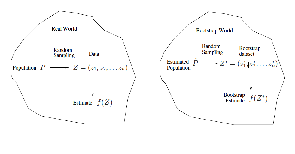 class: center, middle, inverse, title-slide # Bootstrap Confidence Intervals ### Dr. D’Agostino McGowan --- layout: true <div class="my-footer"> <span> Dr. Lucy D'Agostino McGowan </span> </div> --- ## Simulation * Generate `\(\epsilon\)` from the known error distribution -- * Calculate `\(\mathbf{y}=\mathbf{X}\beta+\epsilon\)` from the known `\(\beta\)` and the observed data, `\(\mathbf{X}\)` -- * Use this to compute `\(\hat\beta\)` -- * Do this _many times_ to get a distribution of `\(\hat\beta\)` and estimate the uncertainty from that --- ## Simulation * This sounds **great!** -- * but...we don't know the true error distribution and we don't know the true `\(\beta\)` (womp womp!) --- ## Bootstrap * That is where the bootstrap comes in! -- * The bootstrap tries to estimate the same procedure as the simulation method except instead of sampling from the **true** distribution, we sample from the **observed data** --- ## Bootstrap .question[ Where does the term come from? ] -- _"To pull oneself up by one's bootstraps"_ -- The phrase likely came from an 18th century writing "The Surprising Adventures of Baron Munchausen" by Rudolph Erich Raspe _"The Baron had fallen to the bottom of a deep lake. Just when it looked like all was lost, he thought to **pick himself up by his own bootstraps**."_ --- ## Bootstrap  .small[ _adapted from slides by Hastie & Tibshirani_ ] --- ## Bootstrap * Used to estimate _uncertainty_. -- * For example, the standard error of the estimate or an approximate confidence interval --- ## Bootstrap * Generate `\(\epsilon^*\)` from sampling with replacement from `\(e_1,\dots,e_n\)` (the residuals) -- * Calculate `\(\mathbf{y}^* =\mathbf{X}\hat\beta+\epsilon^*\)` -- * Compute `\(\hat\beta^*\)` from `\((\mathbf{X}, \mathbf{y}^*)\)` --- ## Generate `\(\epsilon^*\)` from sampling with replacement from the residuals | e| |-----:| | 0.02| | 0.02| | -0.23| | 0.42| | -0.23| -- .question[ How would I sample with replacement? ] --- ## Generate `\(\epsilon^*\)` from sampling with replacement from the residuals .question[ How would I sample with replacement? ] | e| e* 1| e* 2| e* 3| e* 4| e* 5| |-----:|-----:|-----:|----:|-----:|-----:| | 0.02| 0.02| -0.23| 0.02| -0.23| -0.23| | 0.02| 0.02| -0.23| 0.02| 0.42| 0.02| | -0.23| -0.23| 0.42| 0.42| -0.23| 0.42| | 0.42| -0.23| 0.42| 0.02| 0.02| 0.02| | -0.23| 0.02| 0.02| 0.42| 0.42| 0.02| --- ## Let's do this in R! * The `sample()` function allows you to resample with replacement. -- ```r sample(c(1, 2, 3), replace = TRUE) ``` ``` ## [1] 2 1 2 ``` -- ```r sample(c(1, 2, 3), replace = TRUE) ``` ``` ## [1] 3 2 2 ``` -- ```r sample(c(1, 2, 3), replace = TRUE) ``` ``` ## [1] 2 2 1 ``` --- ## Let's do this in R! * The `sample()` function allows you to resample with replacement. ```r set.seed(1) sample(c(1, 2, 3), replace = TRUE) ``` ``` ## [1] 1 2 2 ``` ```r set.seed(1) sample(c(1, 2, 3), replace = TRUE) ``` ``` ## [1] 1 2 2 ``` --- ## Let's do this in R! * The `sample()` function allows you to resample with replacement. .pull-left[ .small[ ```r set.seed(1) sample(c(1, 2, 3), replace = TRUE) ``` ``` ## [1] 1 2 2 ``` ```r sample(c(1, 2, 3), replace = TRUE) ``` ``` ## [1] 3 1 3 ``` ```r sample(c(1, 2, 3), replace = TRUE) ``` ``` ## [1] 3 2 2 ``` ] ] -- .pull-right[ .small[ ```r set.seed(1) sample(c(1, 2, 3), replace = TRUE) ``` ``` ## [1] 1 2 2 ``` ```r sample(c(1, 2, 3), replace = TRUE) ``` ``` ## [1] 3 1 3 ``` ```r sample(c(1, 2, 3), replace = TRUE) ``` ``` ## [1] 3 2 2 ``` ] ] -- * **Always set a seed when generating random processes so you can replicate your results** --- class: inverse ## <svg style="height:0.8em;top:.04em;position:relative;" viewBox="0 0 640 512"><path d="M512 64v256H128V64h384m16-64H112C85.5 0 64 21.5 64 48v288c0 26.5 21.5 48 48 48h416c26.5 0 48-21.5 48-48V48c0-26.5-21.5-48-48-48zm100 416H389.5c-3 0-5.5 2.1-5.9 5.1C381.2 436.3 368 448 352 448h-64c-16 0-29.2-11.7-31.6-26.9-.5-2.9-3-5.1-5.9-5.1H12c-6.6 0-12 5.4-12 12v36c0 26.5 21.5 48 48 48h544c26.5 0 48-21.5 48-48v-36c0-6.6-5.4-12-12-12z"/></svg> `Application Exercise` * Set a seed * Use the `sample()` function to sample from the following vector with replacement: `c(1, 2, 3, 4, 5)`