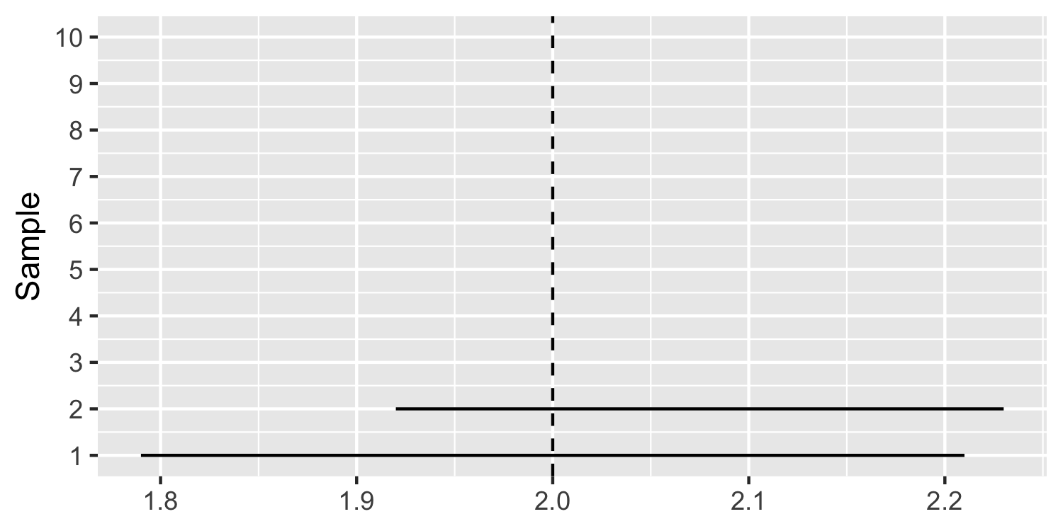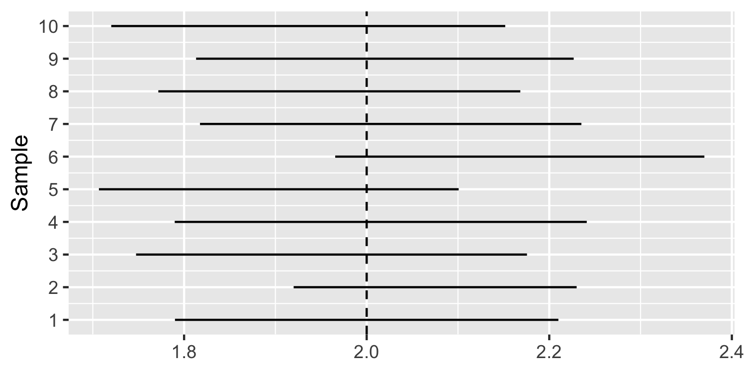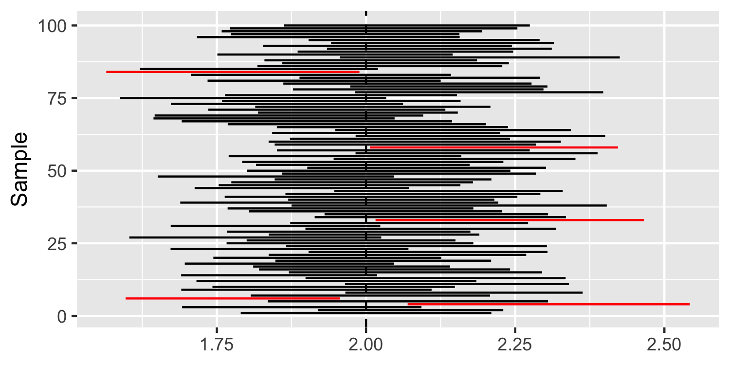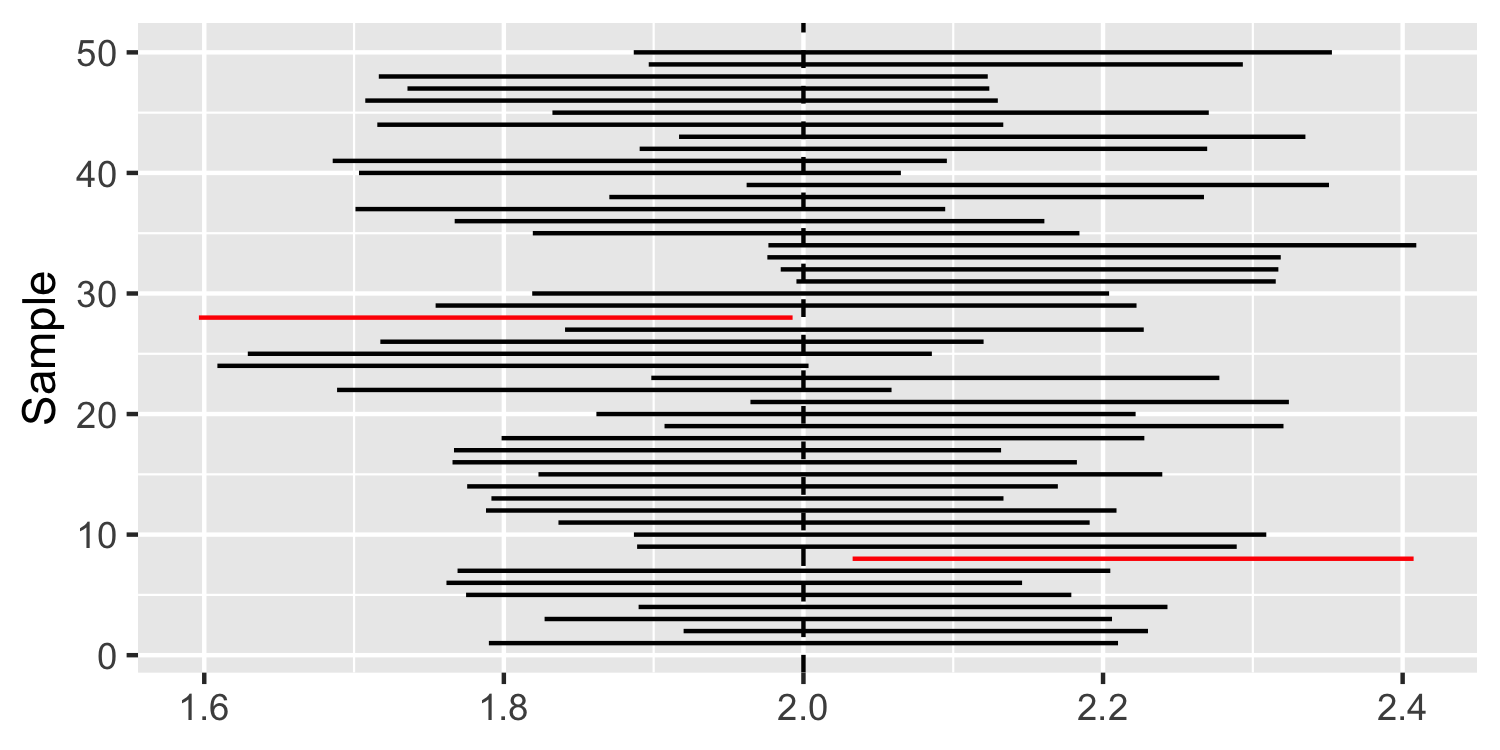 class: center, middle, inverse, title-slide # Confidence Intervals ### Dr. D’Agostino McGowan --- layout: true <div class="my-footer"> <span> Dr. Lucy D'Agostino McGowan </span> </div> --- class: middle # confidence intervals If we use the same sampling method to select different samples and computed an interval estimate for each sample, we would expect the true population parameter ( `\(\beta_1\)` ) to fall within the interval estimates 95% of the time. --- ## What it is **NOT** * 95% CI: (5-9) _We would expect the true population parameter to fall within 5 to 9 95% of the time_ -- <img src = "https://media.tenor.com/images/b9df0c0c41ff93838e8f837ffc54615a/tenor.gif" width = 400></img> --- ## What it is **NOT** * 95% CI: (5-9) ~~We would expect the true population parameter to fall within 5 - 9 95% of the time~~ <img src = "https://media.tenor.com/images/b9df0c0c41ff93838e8f837ffc54615a/tenor.gif" width = 400></img> --- ## What it is **NOT** * 95% CI: (5-9) ~~We would expect the true population parameter to fall within 5 - 9 95% of the time~~ .question[ Why? ] -- * The "true population parameter" is **FIXED**! --- ## The true parameter is **FIXED**! <img src="https://media2.giphy.com/media/3orieOTNvHHCF41C9y/200w.gif" width = 500></img> -- * *when we are talking about confidence intervals, which rely on Frequentist theory. If you take a Bayesian inference class, you will learn about _credible intervals_ which have different assumptions --- ## Example We are interested in the relationship between **Age** and **Wage**. To demonstrate what a _confidence interval_ is, I am going to construct a "truth" for the relationship in Lucy-land. `$$Wage = 2 \times Age + \epsilon$$` -- .question[ What is the "true parameter" for the relationship between `Age` and `Wage`? ] -- * 2! --- ## Example We are interested in the relationship between **Age** and **Wage**. To demonstrate what a _confidence interval_ is, I am going to construct a "truth" for the relationship in Lucy-land. `$$Wage = 2 \times Age + \epsilon$$` * Age ~ Normal(30, 10) * `\(\epsilon\)` ~ Normal(0, 10) * Sample `\(n = 100\)` ```r set.seed(7) n <- 100 sample <- data.frame( Age = rnorm(n, 30, 10) ) sample$Wage <- 2 * sample$Age + rnorm(n, 0, 10) ``` --- ## Example We are interested in the relationship between **Age** and **Wage**. To demonstrate what a _confidence interval_ is, I am going to construct a "truth" for the relationship in Lucy-land. `$$Wage = 2 \times Age + \epsilon$$` ```r head(sample) ``` ``` ## Age Wage ## 1 52.87247 110.93553 ## 2 18.03228 41.93996 ## 3 23.05707 45.32082 ## 4 25.87707 40.01053 ## 5 20.29327 43.67375 ## 6 20.52720 25.01562 ``` --- ## Example We are interested in the relationship between **Age** and **Wage**. To demonstrate what a _confidence interval_ is, I am going to construct a "truth" for the relationship in Lucy-land. `$$Wage = 2 \times Age + \epsilon$$` ```r n <- 100 sample2 <- data.frame( Age = rnorm(n, 30, 10) ) sample2$Wage <- 2 * sample2$Age + rnorm(n, 0, 10) ``` --- ## Example We are interested in the relationship between **Age** and **Wage**. To demonstrate what a _confidence interval_ is, I am going to construct a "truth" for the relationship in Lucy-land. `$$Wage = 2 \times Age + \epsilon$$` .pull-left[ ```r head(sample) ``` ``` ## Age Wage ## 1 52.87247 110.93553 ## 2 18.03228 41.93996 ## 3 23.05707 45.32082 ## 4 25.87707 40.01053 ## 5 20.29327 43.67375 ## 6 20.52720 25.01562 ``` ] .pull-right[ ```r head(sample2) ``` ``` ## Age Wage ## 1 50.23344 105.71950 ## 2 38.62492 74.49258 ## 3 29.75091 60.04891 ## 4 36.00635 68.13020 ## 5 42.16481 80.15938 ## 6 18.23468 24.82762 ``` ] --- ## Example We are interested in the relationship between **Age** and **Wage**. To demonstrate what a _confidence interval_ is, I am going to construct a "truth" for the relationship in Lucy-land. `$$Wage = 2 \times Age + \epsilon$$` Fit a linear model on the `sample` -- |term | estimate| std.error| statistic| p.value| conf.low| conf.high| |:-----------|---------:|---------:|----------:|---------:|---------:|---------:| |(Intercept) | 0.9950715| 3.2797052| 0.3034027| 0.7622261| -5.513397| 7.503540| |Age | 2.0098559| 0.0999765| 20.1032929| 0.0000000| 1.811456| 2.208256| -- ### 95% CI: 1.81, 2.21 --- ## Example .question[ What percent of the time does the "true parameter" fall within this interval? ] |term | estimate| std.error| statistic| p.value| conf.low| conf.high| |:-----------|---------:|---------:|----------:|---------:|---------:|---------:| |(Intercept) | 0.9950715| 3.2797052| 0.3034027| 0.7622261| -5.513397| 7.503540| |Age | 2.0098559| 0.0999765| 20.1032929| 0.0000000| 1.811456| 2.208256| ### 95% CI: 1.81, 2.21 --- ## Example .question[ What percent of the time does 2 fall within this interval? ] |term | estimate| std.error| statistic| p.value| conf.low| conf.high| |:-----------|---------:|---------:|----------:|---------:|---------:|---------:| |(Intercept) | 0.9950715| 3.2797052| 0.3034027| 0.7622261| -5.513397| 7.503540| |Age | 2.0098559| 0.0999765| 20.1032929| 0.0000000| 1.811456| 2.208256| ### 95% CI: 1.81, 2.21 --- ## Example We are interested in the relationship between **Age** and **Wage**. To demonstrate what a _confidence interval_ is, I am going to construct a "truth" for the relationship in Lucy-land. `$$Wage = 2 \times Age + \epsilon$$` Fit a linear model on the `sample2` -- |term | estimate| std.error| statistic| p.value| conf.low| conf.high| |:-----------|---------:|---------:|----------:|---------:|---------:|---------:| |(Intercept) | -2.819931| 3.0542175| -0.9232909| 0.3581233| -8.880926| 3.241064| |Age | 2.078026| 0.0968743| 21.4507408| 0.0000000| 1.885782| 2.270270| -- ### 95% CI: 1.89, 2.27 --- ## Example .question[ What percent of the time does 2 fall within this interval? ] |term | estimate| std.error| statistic| p.value| conf.low| conf.high| |:-----------|---------:|---------:|----------:|---------:|---------:|---------:| |(Intercept) | -2.819931| 3.0542175| -0.9232909| 0.3581233| -8
